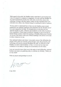 ශුද්ධෝත්තම දලයි ලාමා වහන්සේ උන්වහන්සේගේ පණිවිඩයෙන් ශ්රී ලංකාවේ ජනතාව මේ මොහොතේ දී පත්ව ඇති අසීරූතාවයන්ගෙන් මිදී වඩා යහපත් අනාගතයකට ප්රාර්ථනා එක් කරන අතර මෙම කරදරකාරි තත්ත්වය ඉක්මනින් පහව ගොස් ශ්රී ලංකාවාසී ජනතාවට සාමය සතුට සහ සෞභාග්යය ලැබේවායි ආශිර්වාද කරති.
