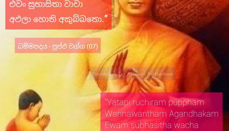 DhammapadaNews Life with Dhammapada #22 On Sep 1, 2020 Share “යමෙක් මනාව දේශනා කරන ලද ශ්රී සද්ධර්මය අනුගමනය නොකරමින් හැසිරෙයිද, ඔහු හරියට වර්ණයක්, ලස්සනක් තිබුණත් සුවඳක් නැති මලක් වගෙයි”. ධම්මපදය – පුප්ඵ වග්ග (07) “Just like a beautiful flower which has colour, but lack fragrance, so are well- spoken words fruitless for the one who acts not on them” The Dhammapada – Puppha Wagga (07) Share FacebookTwitterGoogle+WhatsAppEmailTelegramViberPrint