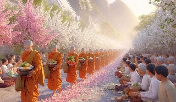 “අර වෙලඹුන් හතර දෙනෙක් බැඳපු අශ්ව රථයෙහි මැදට වෙලා ගමන් කරන කෙනෙක් ඉන්නවා නේද? එයා අපේ මධ්යම පුතා. මසුරු කෙනෙක් නෙමෙයිනේ. දානපතියෙක්. ඒකයි එයා බබළන්නේ. අර රන්සිවි ගෙයකින් ගෙනයන දෙවඟනක් ඉන්නවානේ, ඇය හරි නුවණැතියි. මුවැත්තියකගේ අඩවන් නෙත් තියෙනවා. ඒ අපේ බාල දෝණි. තමාට ලැබුණු කොටසින් භාගයක්ම දන් දුන්නා. දැන් ඉතින් සැපසේ සතුටු වෙනවා. ඔය දරුවෝ ටික ඉස්සර දන් දුන්නා. සිත පහදවාගෙන ශ්රමණ බ්රාහ්මණයන්ටයි දන් දුන්නා. ඒකට අපි මසුරුකමින් හිටියා, ශ්රමණ බ්රාහ්මණයන්ට නින්දා අපහාස කළා, දරුවෝ දිව්ය සැපෙන් සතුටු වෙනවා, ඒකට අපි කපල අව්වේ දාපු බටගස් වගේ වේළි වේළී ඉන්නවා.”