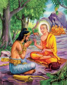 එක්තරා වෙළෙඳ නායකයෙකු විශාල සේවක පිරිසක් සමඟ මුහුදු මඟින් පිටරටකට යද්දී හදිසියේ ම නැව පළුදුවී මුහුදුබත් වන ලකුණු පහල විය .බොහෝ අය බියට පත්ව කන්නලව් කරමින් තම ජීවිත රැක ගැනීමට දෙවියන්ගේ සහාය පැතූහ. මේ අතර මා ඉතා ධාර්මිකව බොහෝ උත්සාහයෙන් කටයුතු කොට සියලු ජයග්රහණය ලබාගෙන තියෙනවා. අදත් මා කන්නලව් කරමින් නොසිට, උත්සාහයෙන් ජීවිතය රැකගන්න ඕන.යයි සිතූ වෙළෙඳ නායකයා මුහුදට පැන පිහිනන්නට විය. මේ අවස්ථාවේ කන්නලව් කරමින් සිට අය වෙත නොව, ධාර්මිකව උත්සාහයෙන් කටයුතු කොට දිවි රැක ගැනීමට පිහිනන මනුෂ්යයා රැකගතයුතු යැයි සිතා දෙවියන් විසින් වෙළෙඳ නායකයා රැකගත් බව බෞද්ධ සාහිත්යයෙහි සඳහන් වෙනවා. පූජා වට්ටි පිළිගැන්වීමෙන් හෝ කන්නලව් කිරීමෙන් නොව උසස් ගුණධර්ම ක්රියාත්මක කිරීම තුළින් දෙවියන්ගේ පවා ආශිර්වාද ලබා ගත හැකි බව ඉහතකතාවෙන් සහ සිදුවීමෙන් පැහැදිලි වෙනවා.