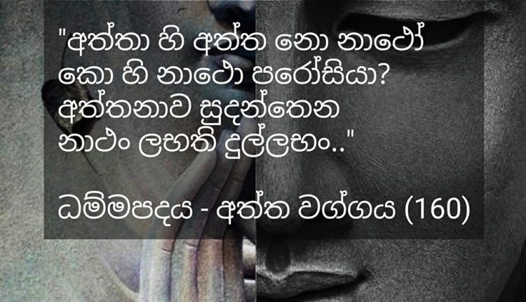 Dhammapada Life with “Dhammapada” #02 On Jul 31, 2020 Share “තමාට පිහිට තමාම ය. වෙන කවරෙක් තමාට පිහිට වන්නද? මනාව හික්මුණු සිතක් ඇත්තාට දුර්ලභ වූ පිහිටක් නිරන්තරයෙන් ම ලැබේ”. ධම්ම පදය – අත්ත වග්ගය (160) “Oneself is one’s own protector (refuge); What other protector (Refuge) can there be? With oneself fully controlled, one obtains a protection (refuge) which hard to gain. “ The Dhammapada – Aththa Waggaya – (160) Share FacebookTwitterGoogle+WhatsAppEmailTelegramViberPrint