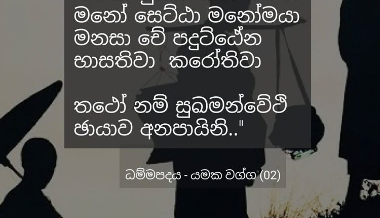 “සිතේ ඇතිවෙන සිතුවිලි සිත මුල්කරගෙන පවතී. එම සිතුවිලි සිත ශ්රේෂ්ට කොටගෙන පවතියි,සිතින්ම උපදියි. ඒ නිසා කෙනෙක් යහපත් සිතින් යමක් කියන්නේ හෝ කරන්නේ නම් තමා අත්නොහැර යන සෙවණැල්ල සේ සතුට ඔහු පසුපසින් ගමන් කරයි”.