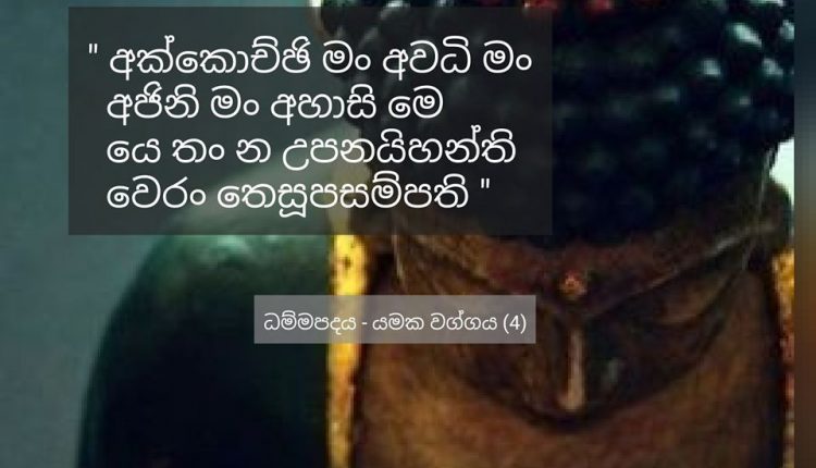 “අසවල් කෙනා මට බැන්නා, මට පහර දුන්නා. මාව පරාජය කළා, මගේ දේ පැහැරගත්තා” යැයි නොසිතමින් , යම් කෙනෙක් ක්රෝධය අත් හැරියහොත්, ඒ අයගේ වෛරය සන්සිඳේ”