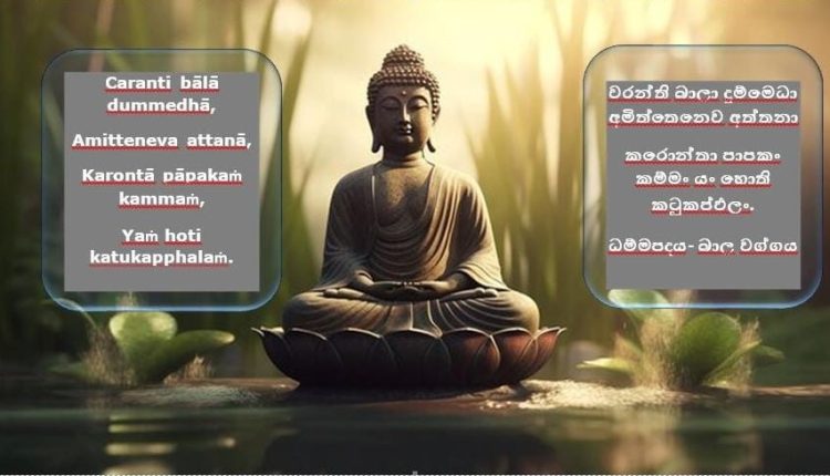 Dhammapada Life with Dhammapada 37 On Jul 12, 2023 Share මෙලෝ පරලෝ වැඩ අවැඩ නොදන්නාවූ බාලයෝ, යම් කර්මයක් දුක් විපාක උපදවන්නේ ද, එ බඳු පාපකර්ම කරමින් තමන්හට සතුරකු වැනි වූ ආත්මයෙන් යුක්ත ව කල් යවති. ධම්මපදය බාල වග්ගය Fools with no intelligence, Have themselves as their own enemies, Committing evil deeds, Which produce bitter fruits. Share FacebookTwitterGoogle+WhatsAppEmailTelegramViberPrint