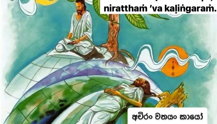 Dhammapada Life with Dhammapada 50 On Nov 30, 2023 Share ඇත්තෙන්ම මේ ශරීරය එච්චර කාලයක් තියෙන එකක් නොවෙයි. විඤ්ඤාණය පහ වුණාට පස්සෙ වැඩකට ගන්ට බැරි දරකඩක් වගේ, මහ පොළොවෙ වැතිරෙනවා. ධම්මපදය චිත්ත වග්ගය Before long, alas! this body will lie upon the ground, cast aside, devoid of consciousness, even as a useless charred log. Share FacebookTwitterGoogle+WhatsAppEmailTelegramViberPrint