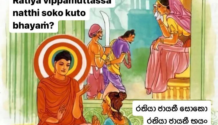 Dhammapada Life with Dhammapadaya 43 On Oct 23, 2023 Share (පංචකාමගුණ) රතිය නිසා ශෝකය උපදී. රතිය නිසා භය හටගනී. රතියෙන් මිදුනු සිතැත්තහුට කිසි ශෝකයෙක් නැත. බියෙක් කොයින් ද? ධම්මපදය පිය වග්ගය From passion springs grief, from passion springs fear; for him who is wholly free from passion there is no grief, much less fear. Share FacebookTwitterGoogle+WhatsAppEmailTelegramViberPrint