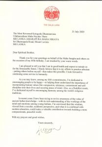 මාගේ 85 වැනි ජන්ම දිනය නිමිත්තෙන් මහා සංඝයා වහන්සේලා නියෝජනය කරමින් ඔබවහන්සේ මට එවන ලද උපන්දින සුභ පැතුමට බෙහෙවින් ම ස්තුතිවන්ත වෙමි. ඔබේ වදන් මගේ හදවතට බොහෝ සෙයින් සමීප වූ බව සඳහන් කළ යුතුමය.