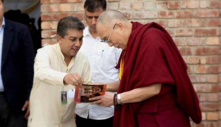 SLTBBS President Dr. Damenda Porage and Member Ven. Somawansa met His Holiness the Dalai Lama in Delhi Sri Jawaharlal Nehru University. His Holiness the Dalai Lama is going through his biography written in Sinhala by Jinadasa Hewage published by Sri Lankan Tibetan Buddhist Brotherhood Society.